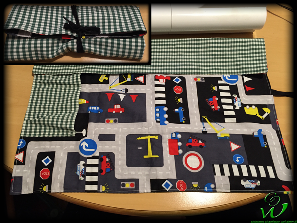 Die Garage muss ich, oh Schande, gestehen habe ich einfach mit Augenmaß gemacht. Ich habe einfach die Seiten rein geklappt -so wie es später beim aufrollen gemacht wird- und da den Stoff zirka 3cm über den Rand links und rechts dann abgeschnitten.