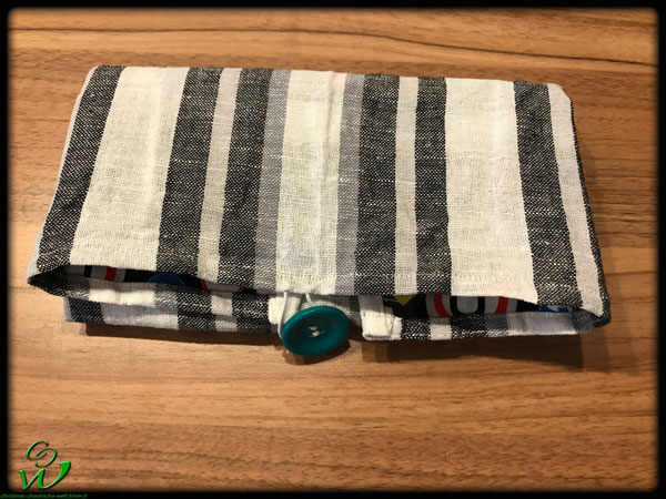 Je nach Art des Verschlusses befestigt ihr die Bänder am Stoff wo sie am Ende sein sollen oder eben den Gummi. Faltet die Stoffe testweise zusammen um zu ermitteln wo der Knopf hin muss. Markiert euch die stelle mit einem Stift und näht anschließend den Knopf auf den Aussenstoff.