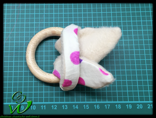 – einen Speichelfesten Holzring – am besten Schnullerketten/Stillketten tauglich- oder Beissring