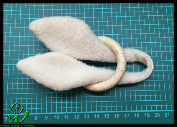 Ihr übertrag das Schnittmuster auf den Stoff, schneidet es aus und steckt rechts auf rechts ab. Wenn ihr Knisterfolie verwenden wollt, steckt diese gleich bei den „Ohren“ mit ab um sie beim rum nähen gleich einzuarbeiten.