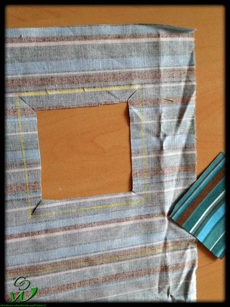 Bei dem länglichen Stück Stoff zeichnet ihr euch am besten in der Mitte eine Linie ein (also bei 16cm). Es ist eine gute Hilfe bei der Arbeit. Messt euch ein Fenster mit der Größe von ca 8x8cm auf der einen Seite in der Mitte aus und zeichnet es mit der Kreide ein. Anschließend geht dann etwa einen Zentimeter noch weiter rein und schneidet das innere Viereck aus. Diagonal zum äusseren Rand in der Mitte schneidet ihr den Stoff danach ein.