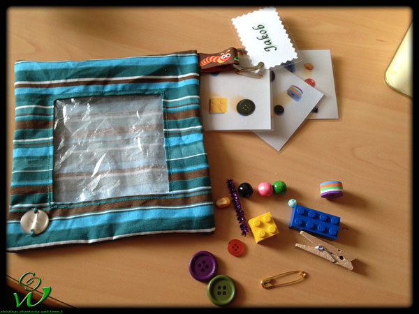 Wenden und die Ecken ausdrücken. Füllen mit dem Spielzeug und dem Reis. Die Wendeöffnung mit dem Matratzenstich verschließen und die Kärtchen auf dem Schlüsselring anbringen. Fertig ist das Spioniersäckchen!