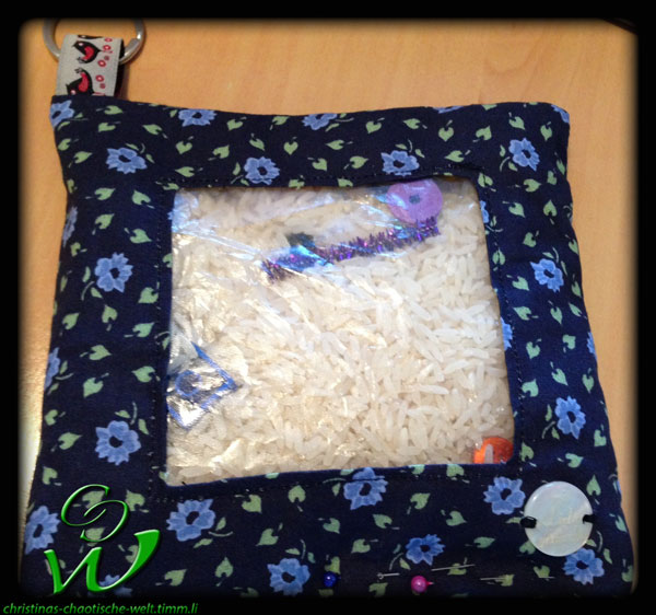 31.08.14 Für die Spielgruppe als Abschiedsgeschenk habe ich sie mit Reis und Klarsichthüllen gemacht. Später habe ich sie nun mit der Plastik Tischdecke und Granulat ausprobiert und mir gefallen sie um einiges besser! Nur zum nähen ist die Klarsichthülle besser da sie nicht festklebt an der Maschine wie die Tischdecke.