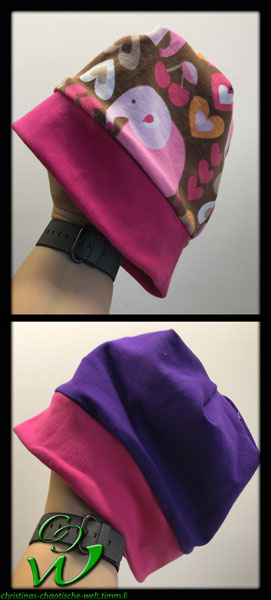 Letztes Jahr machte ich schon eine Haube für meinen Großen und seine Freundin. Auch die Nachbarstochter wurde mit einer beglückt. Doch fing jetzt im Herbst erst die große Haubenproduktion bei uns an. Mäuschen brauchte eine und wenn die eine kriegt muss der Große doch auch wieder eine bekommen. Sie bekamen natürlich auch den passenden Loop gleich dazu.